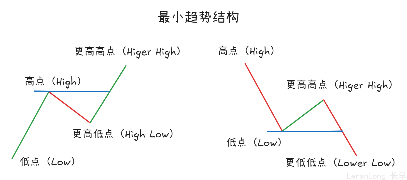 连续三段存在重叠部分就是一段趋势,即 N 字型结构。简而言之有更高高点、更高低点产生,或更低高点或更低低点产生,即价格突破前高点或前低点就是最小趋势被确认。
