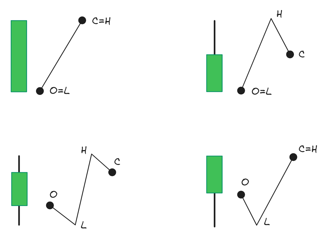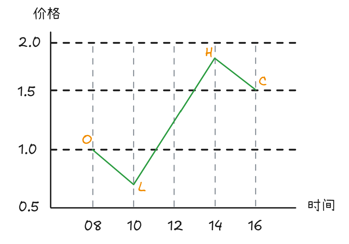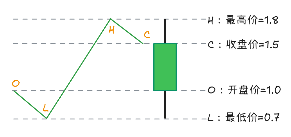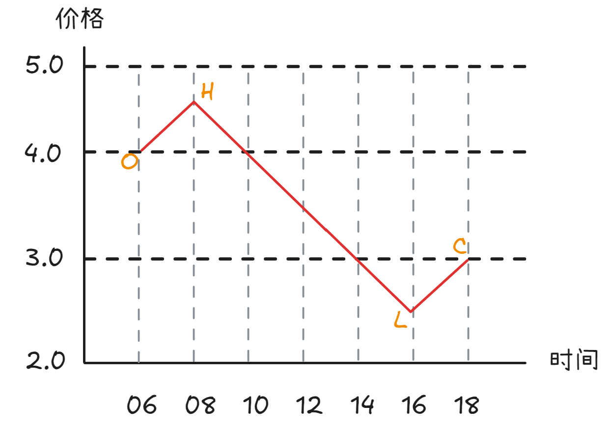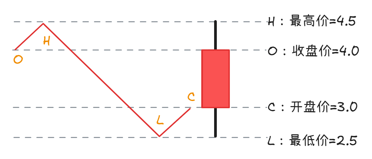 由上面一天的价格折线图,画出一根对应的 “阳 K 线”,如下图: