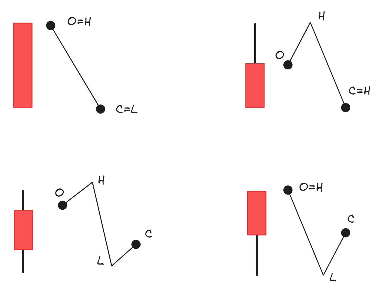 由上面一天的价格折线图,画出一根对应的“阴 K 线”,如下图:
