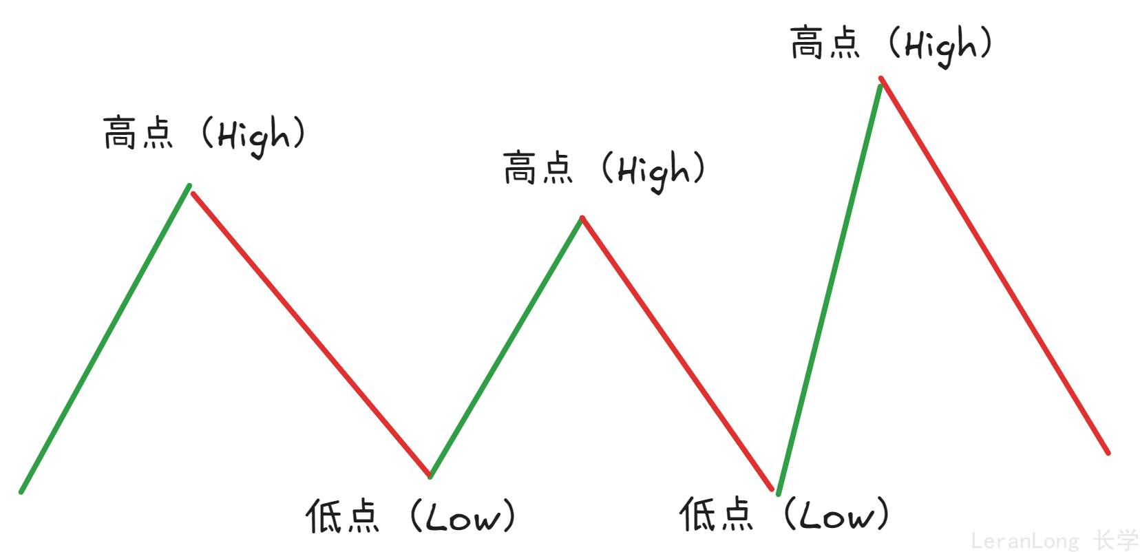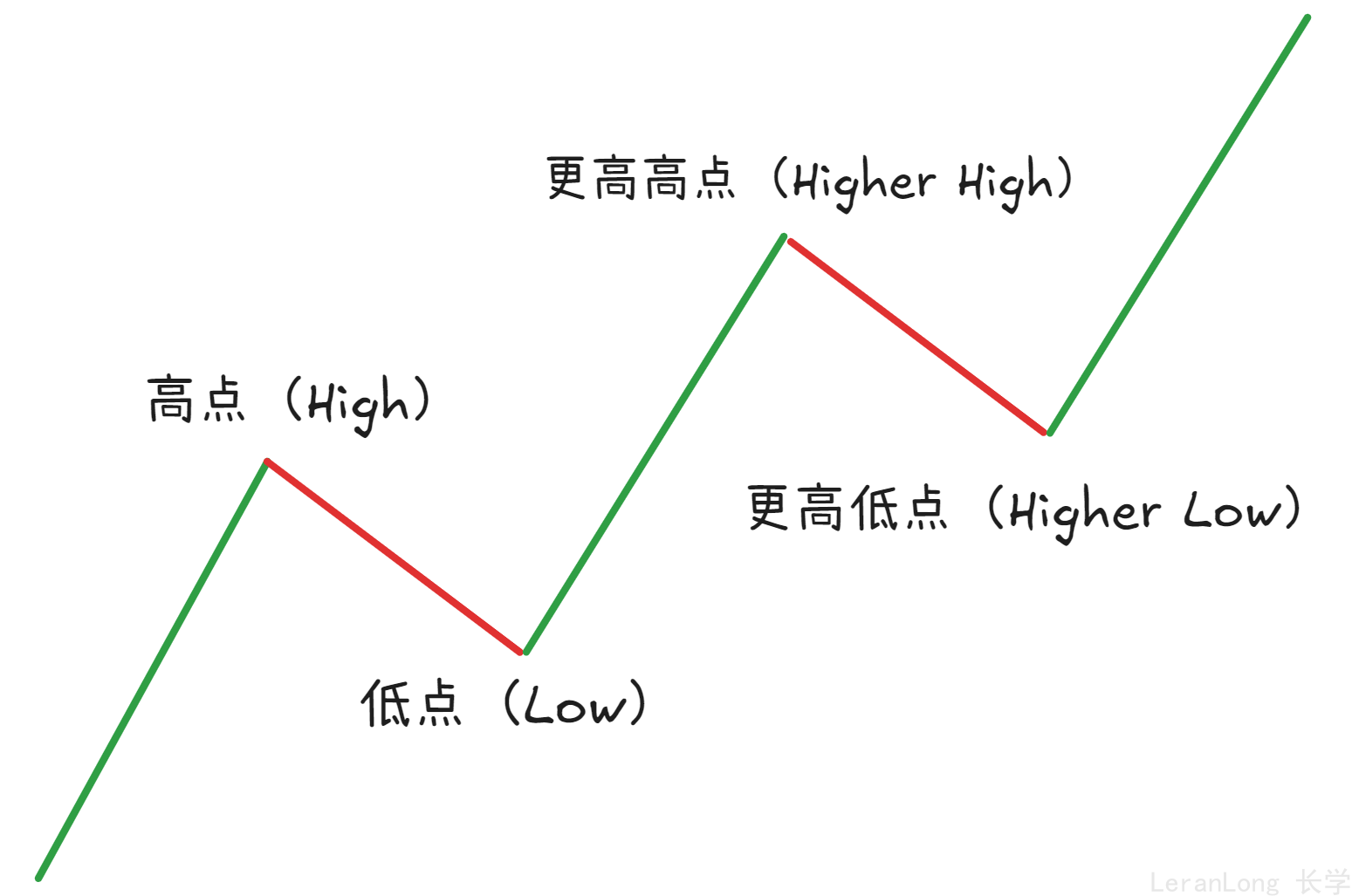 一段趋势中至少出现有连续两个不断抬高的低点和两个不断抬高的高点时,即上升趋势。