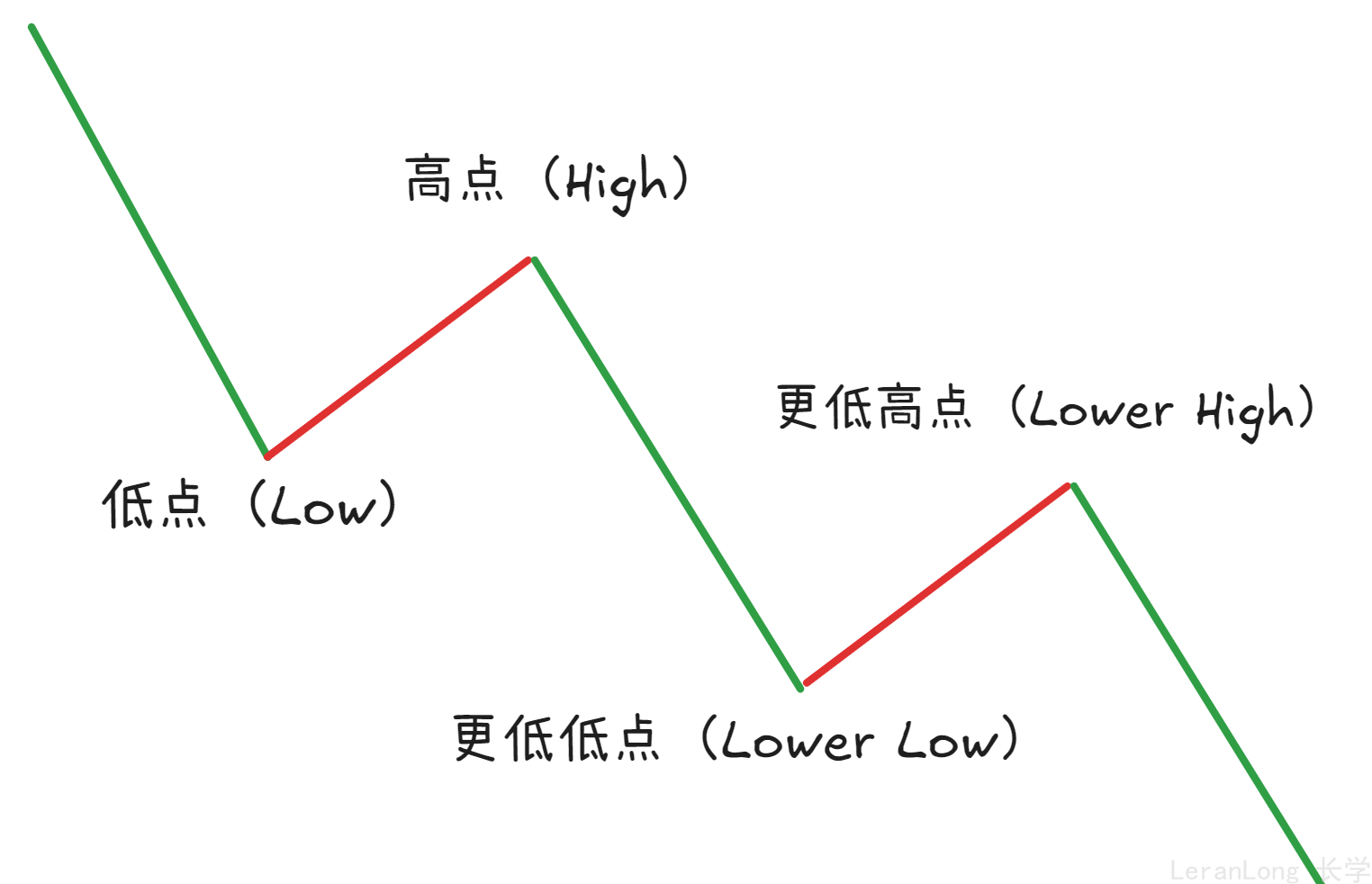 一段趋势中至少出现有连续两个不断降低的高点和两个不断降低的低点时,即下跌趋势。