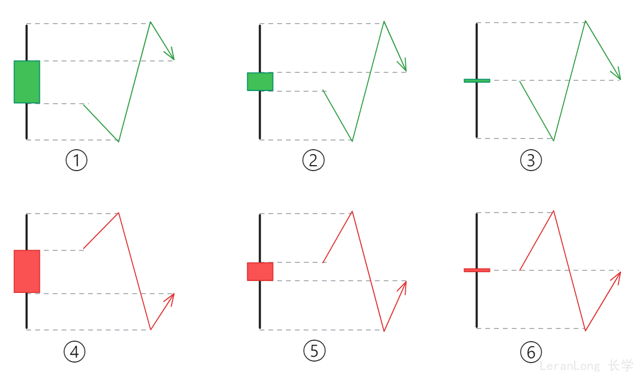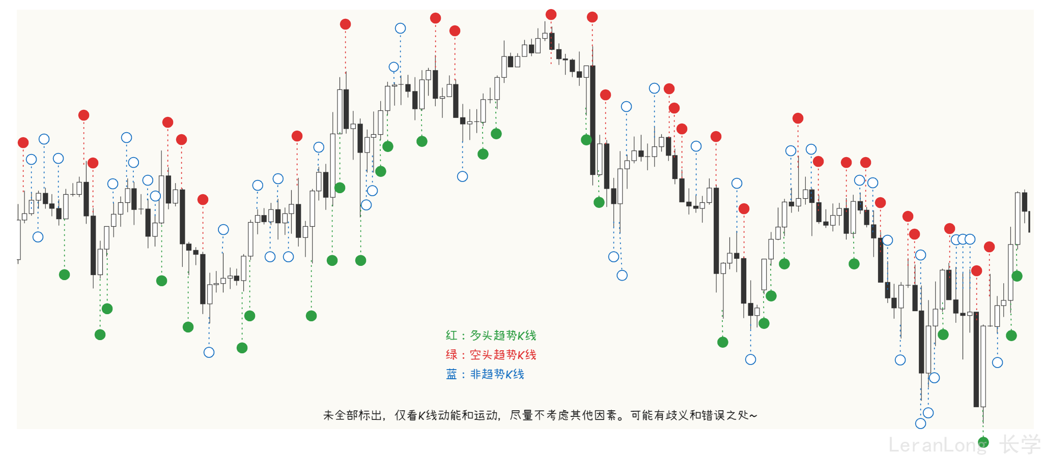- 以上 6 根 K 线都无法明显看出多空哪方掌控了局面,或者说哪方更有优势,K 线的判别应结合盘面前后 K 线来看的,有点偏主观,但应该始终记住「凡是看不出哪方占优就是非趋势 K 线」。