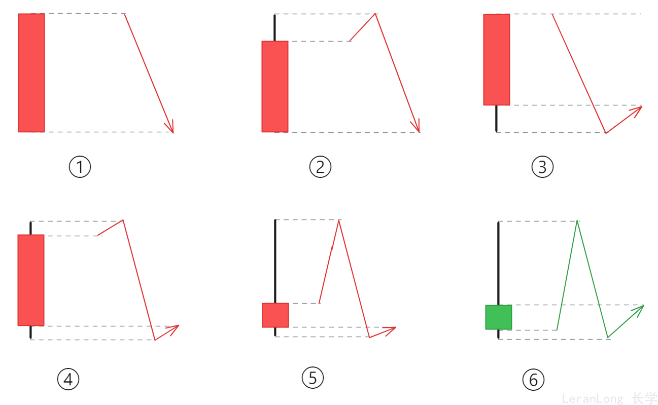 - 强势拉升的多头:①②③④号 K 线能明显看出多头掌控了局面,价格直接从底部拉到了顶部,且它们即使有上下影线也是很短的那种。